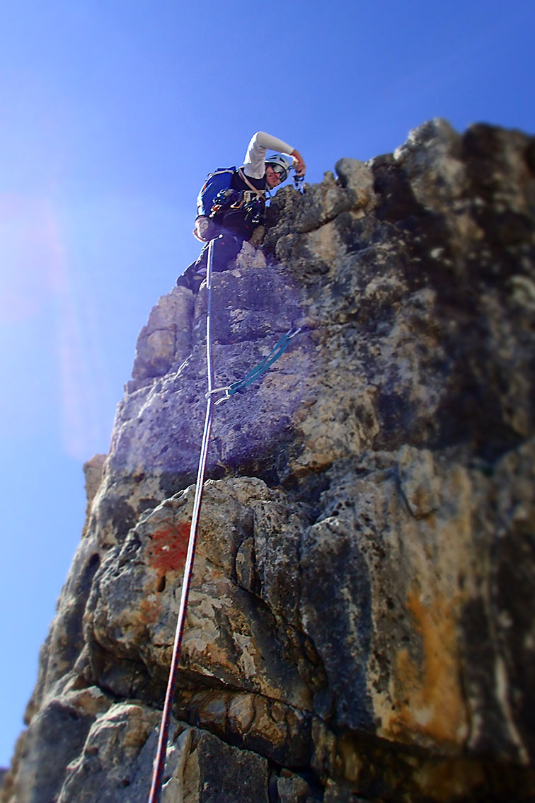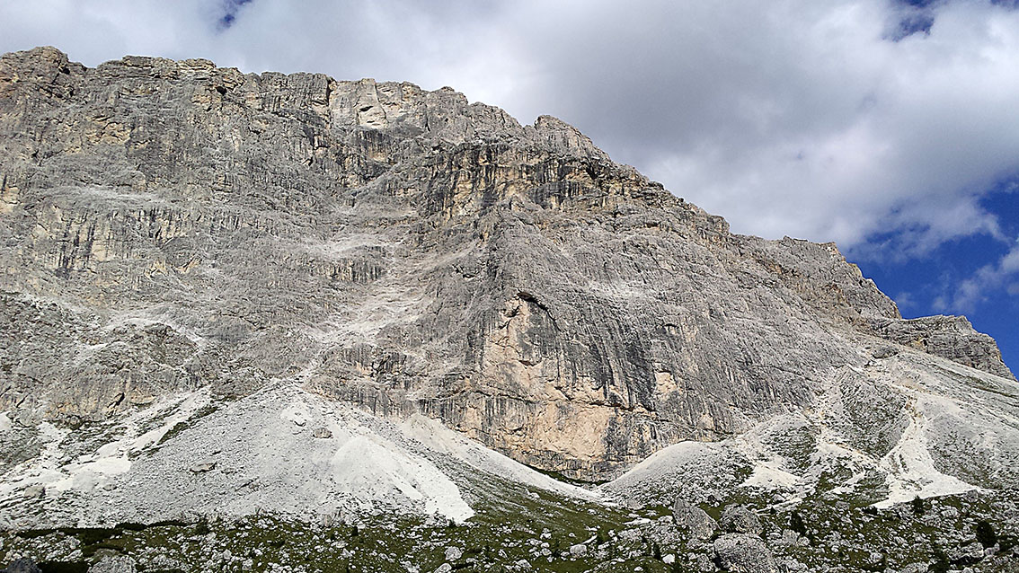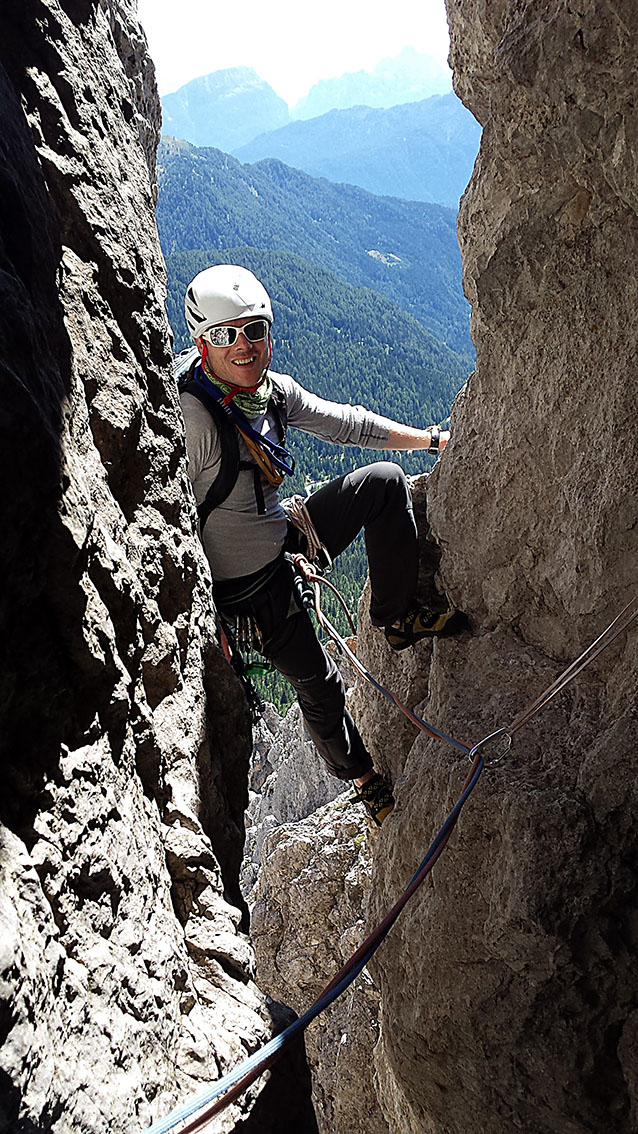 Dolg ponedeljek smo preplezali v smeri Sudkante v Hexensteinu (IV-, 200 m). Smer je bila prijetno vroča, kasneje pa spolirana in začinjena v dveh mikroodsekih. Za posladek na vrhu razgled na lunarno dolomitsko pokrajino. Zvečer, kot se spodobi, pa seveda kulinarični užitki.