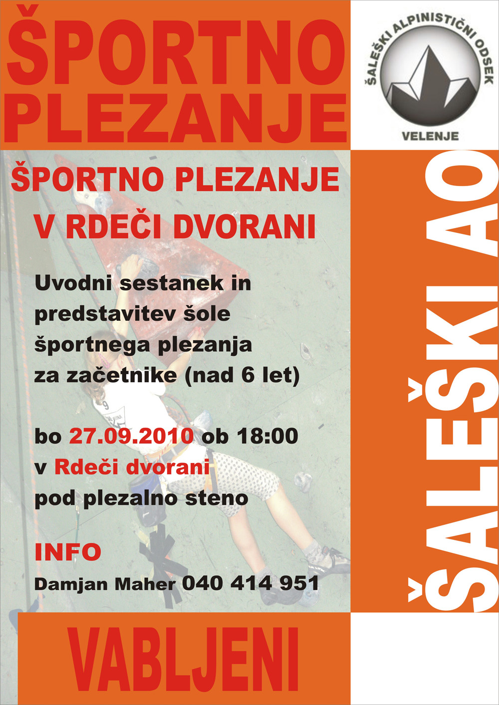 Uvodni sestanek in predstavitev šole športnega plezanja za začetnike (nad 6 let) bo 27.09.2010 ob 18:00 v Rdeči dvorani pod plezalno steno.