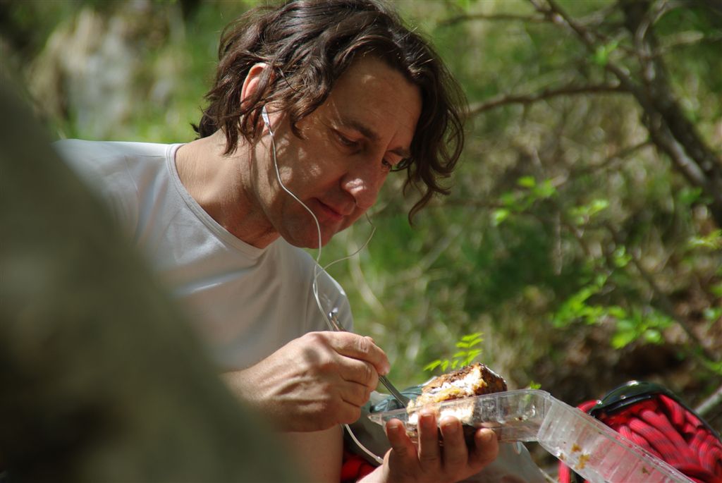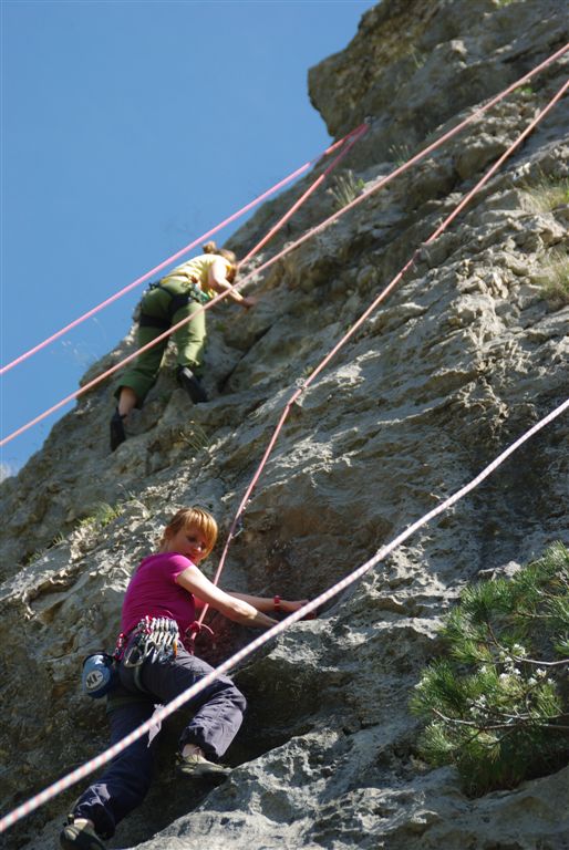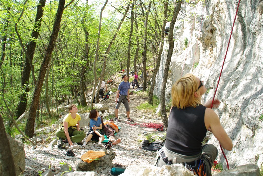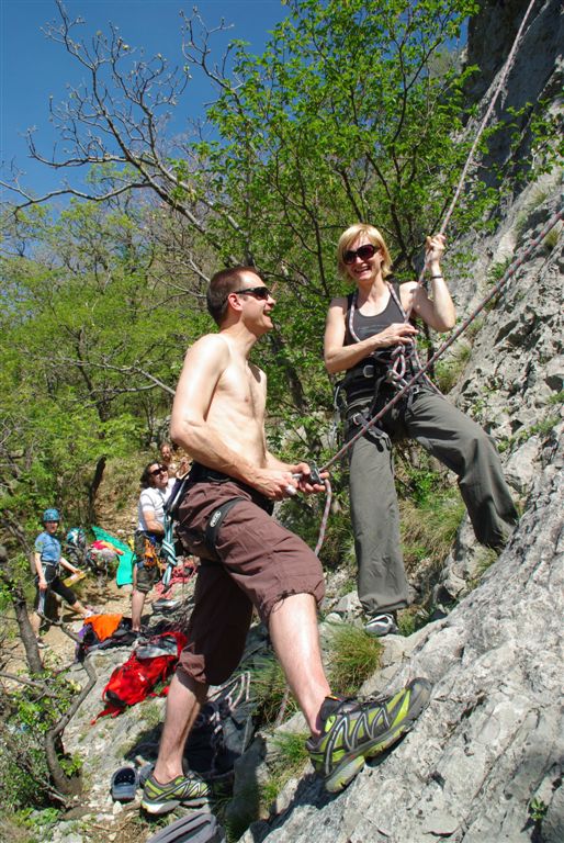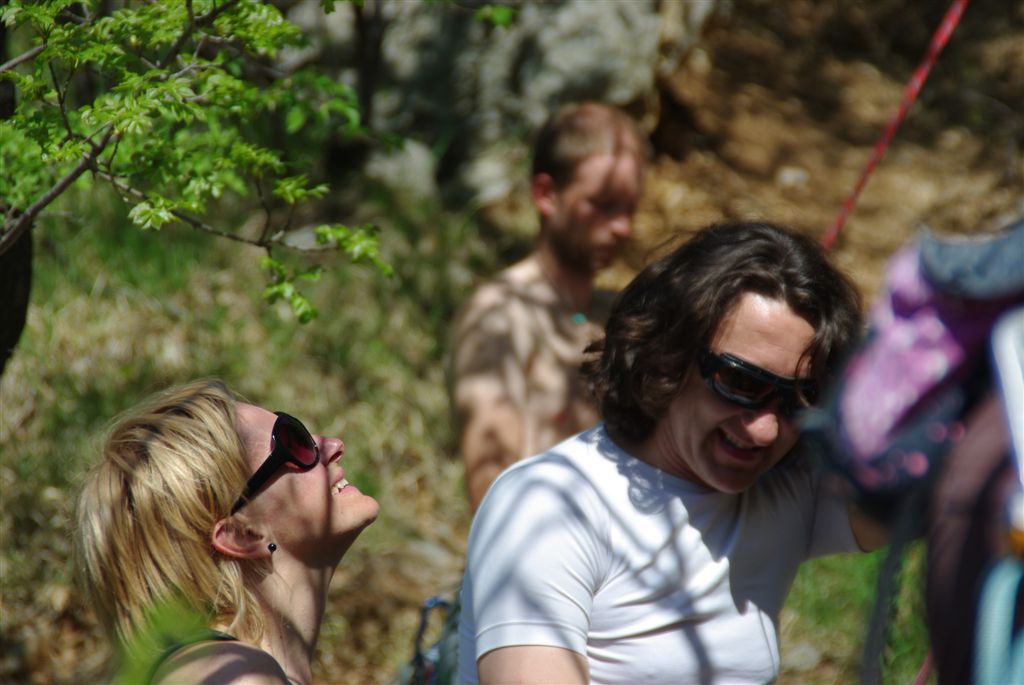 Po parih urah solidnega plezanja relativno lahkih smeri smo se prestavili v drugi sektor, kjer so nas čakale tudi kakšne težje smeri, kar je v mojem primeru že šestka. Napeljevati šestko nisem bil pripravljen, tako da jo je Tanja napeljala, jest pa sem jo začel na Top rope. Nisem je čisto tekoče splezal, malo me je navilo, malo vrglo dol, na koncu pa sem nekako le prišlel do vrha. Posledice tega napora sem čutil v vseh naslednjih smereh, ki sem jih preplezal do konca dneva. Pri opazovanju drugih sem videl, da se vsi trudijo po svojih najboljših močeh in, da je večina zadovoljna s svojimi dosežki - bolj notranjimi kot zunanjimi. Občutek sem imel, da večina bojuje boj predvsem v glavi, skala pa je samo orodje za doseganje abstraktnega cilja. In ker ima vse svoje meje, se je ob 17 uri popoldne videla utrujenost pri skoraj vseh, razen pri meni seveda, he he. Žejni in utrujeni smo spakirali in odšli do baznega parkinga. Od tam smo se razbežali v paničnem iskanju prve gostilne, ki smo jo našli takoj za mejnim prehodom. Ko smo zadovoljili enega od osnovnih človeških nagonov - žejo, smo začeli iskati rešitev za drugi nagon - hraaano. Odrešitev je prinesla natakarica z nasvetom, kam po dobro hrano – v picerijo Etna, ki se nahaja v eni enosmerni ulici. O hrani samo slavospevi, že dolgo nisem jedel kaj tako okusnega. Polona, Tom in jaz smo se odpeljali prej (seveda smo plačali račun) tako, da je tam spet ostalo 8/11 skupine. Deja vu.