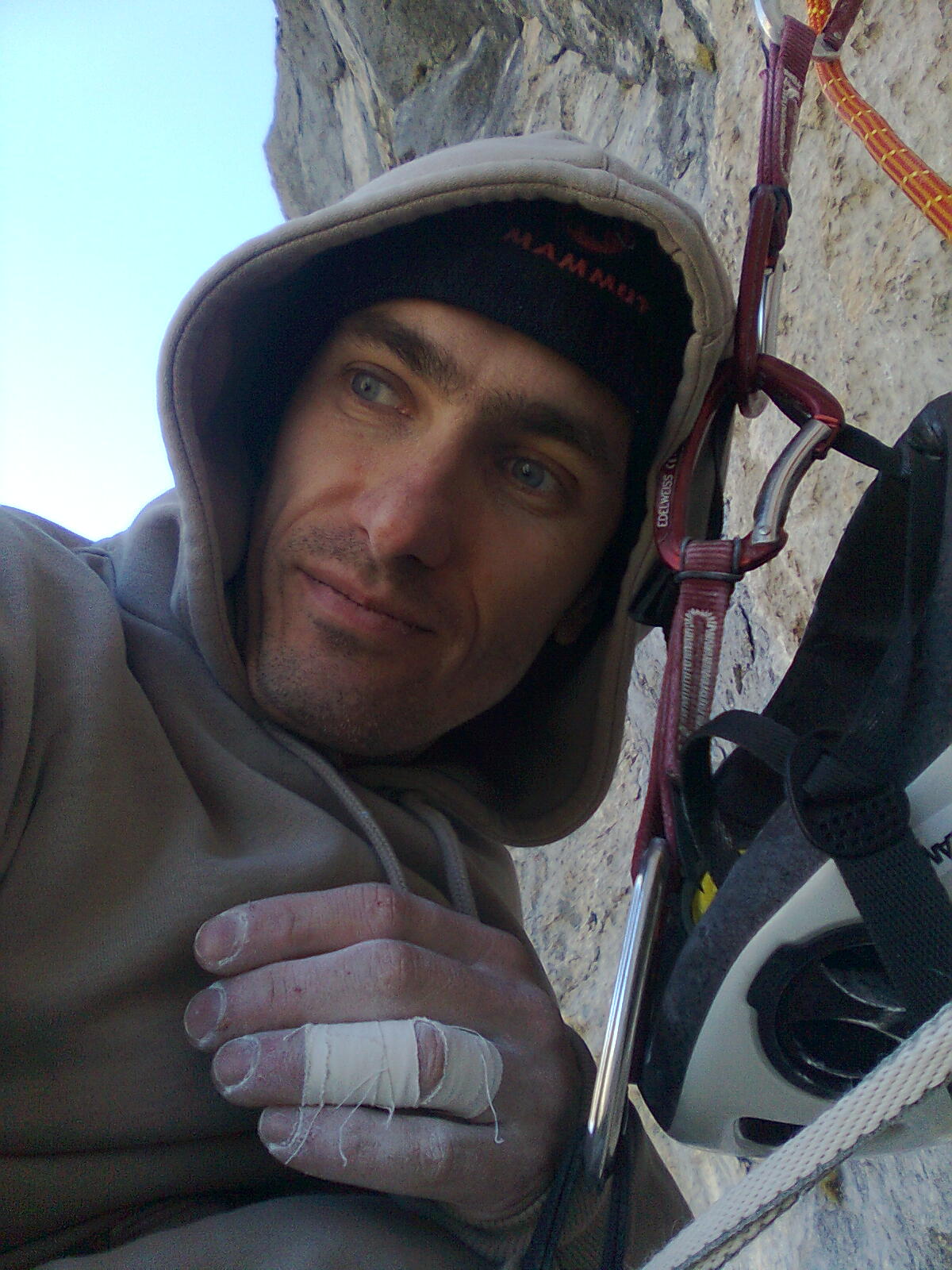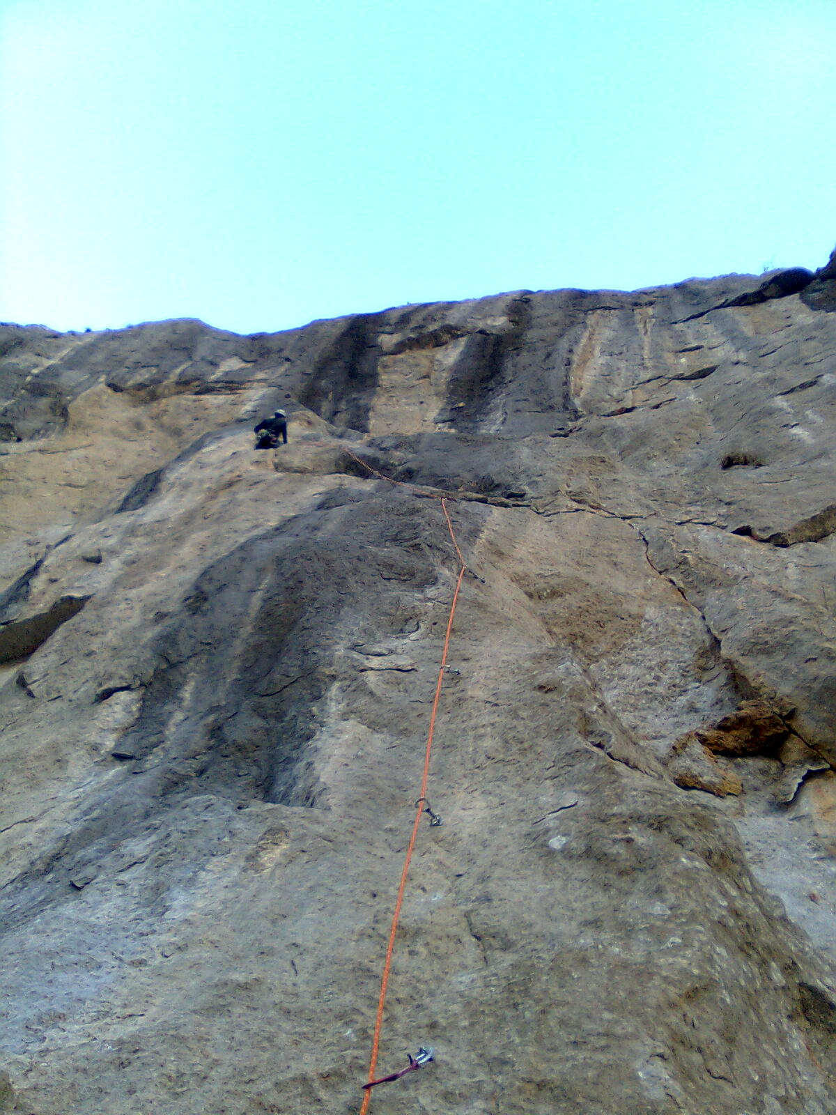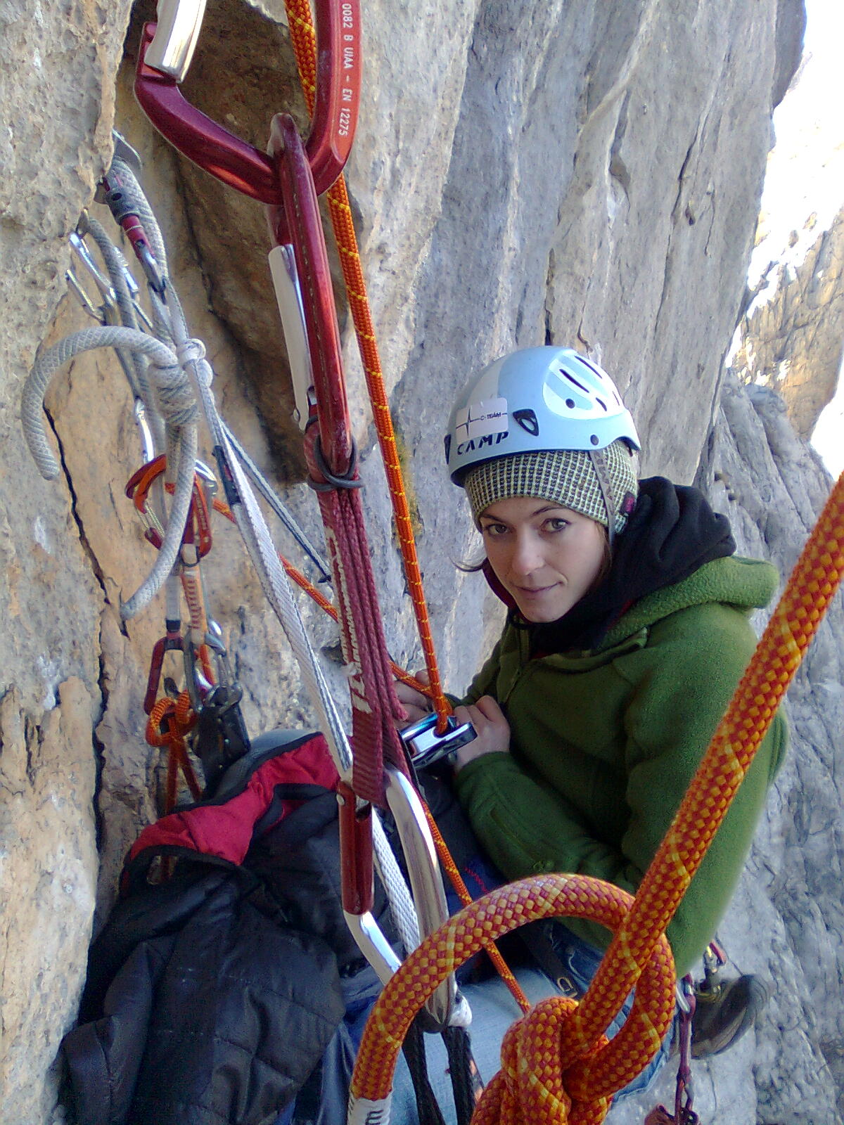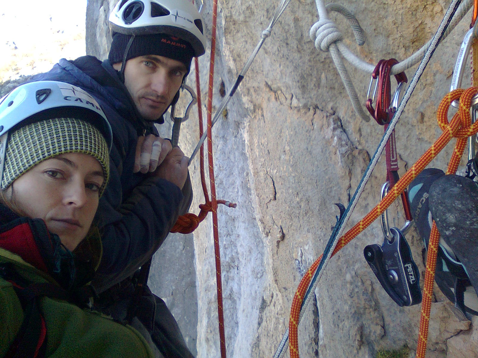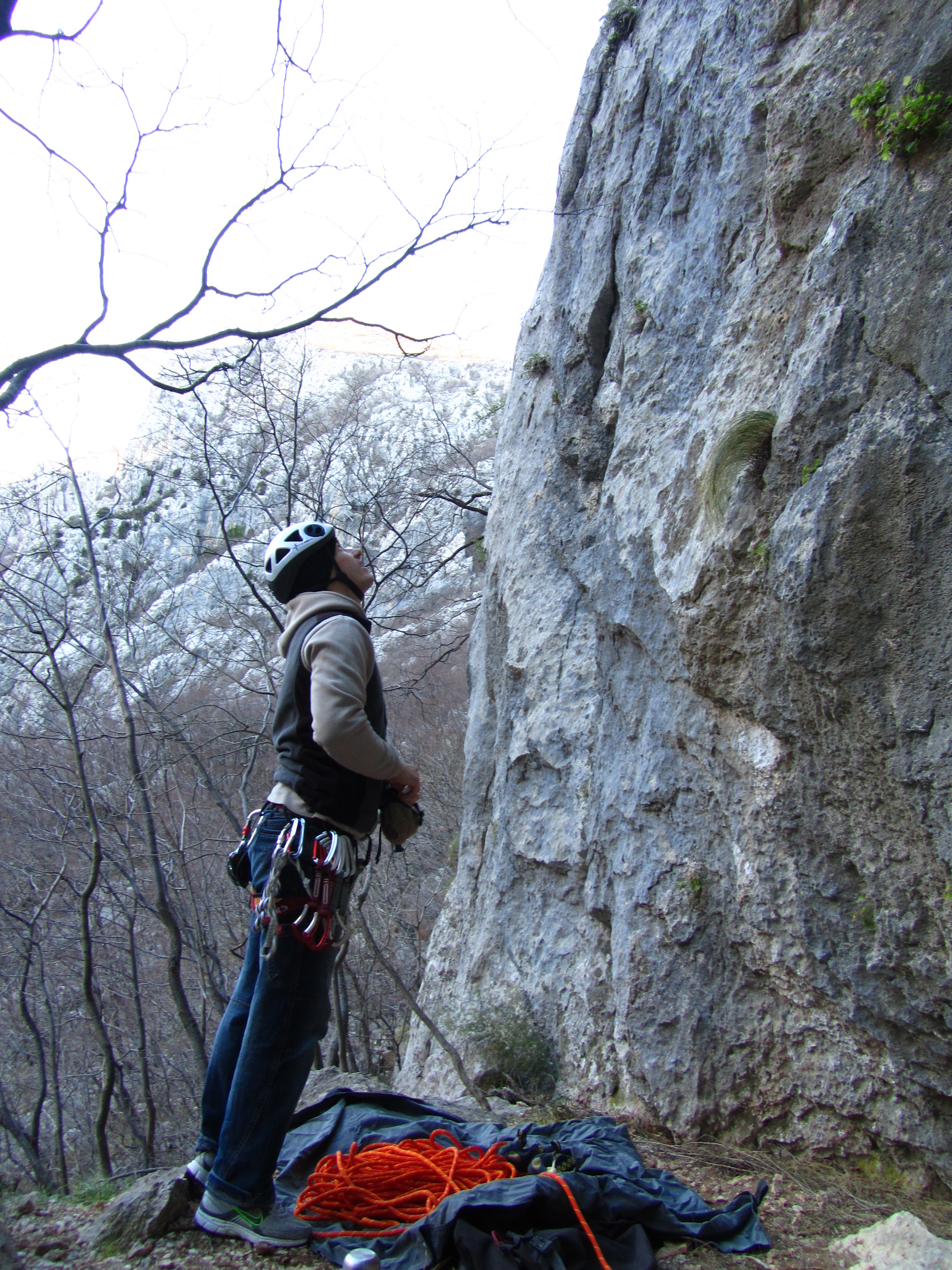 Ko sva v nedeljo, 25. 12., dopoldan prispela v Paklenico, je bil veter tako močan, da je morje neslo dobesedno po zraku. Ampak velika stena naju je klicala, oziroma je klicala Gorazda, jaz je namreč nisem slišala :). Za prvi dan je bil plan ogledati si gibe v najtežjem raztežaju. Plezanje je bilo zaradi mraza in vetra tako naporno, kot še nikoli. Za boljšo predstavo naj omenim le, da sva plezala v puhovki in ni bilo nič vroče. Še nikoli v življenju me ni tako zeblo... Poleg tega se je tudi planiran ogled gibov končal zgolj pri približku, saj grifov skoraj ni bilo čutiti.