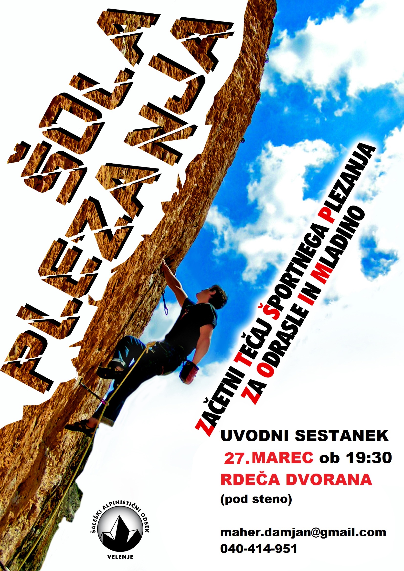Vabimo na začetni tečaj športnega plezanja za odrasle in mladino nad 16 let.