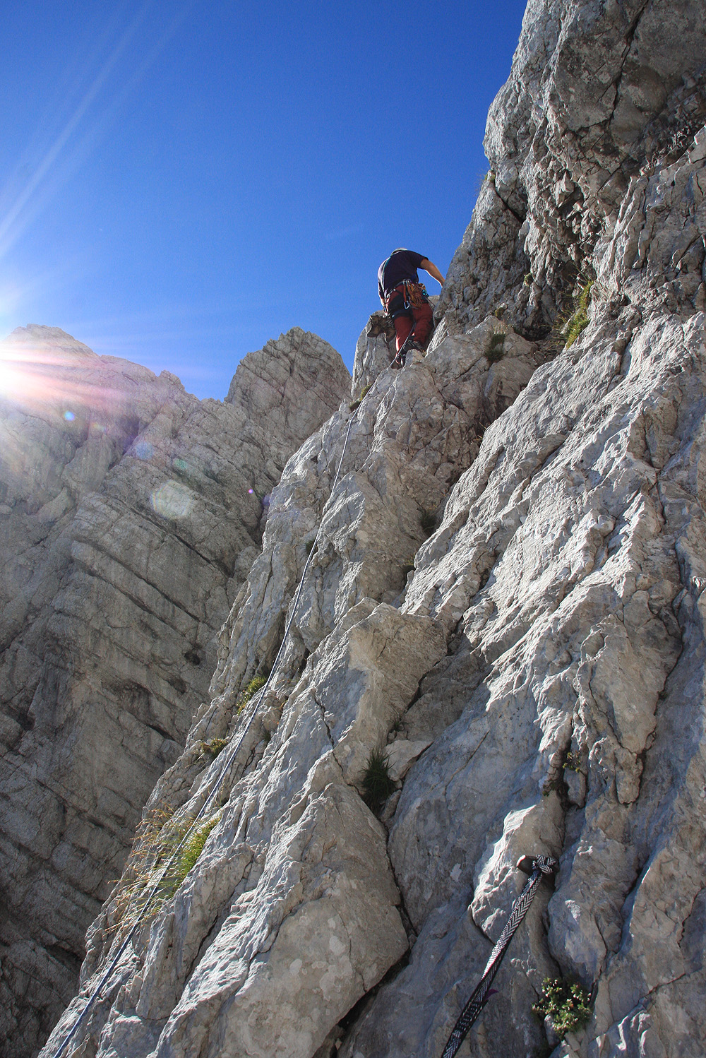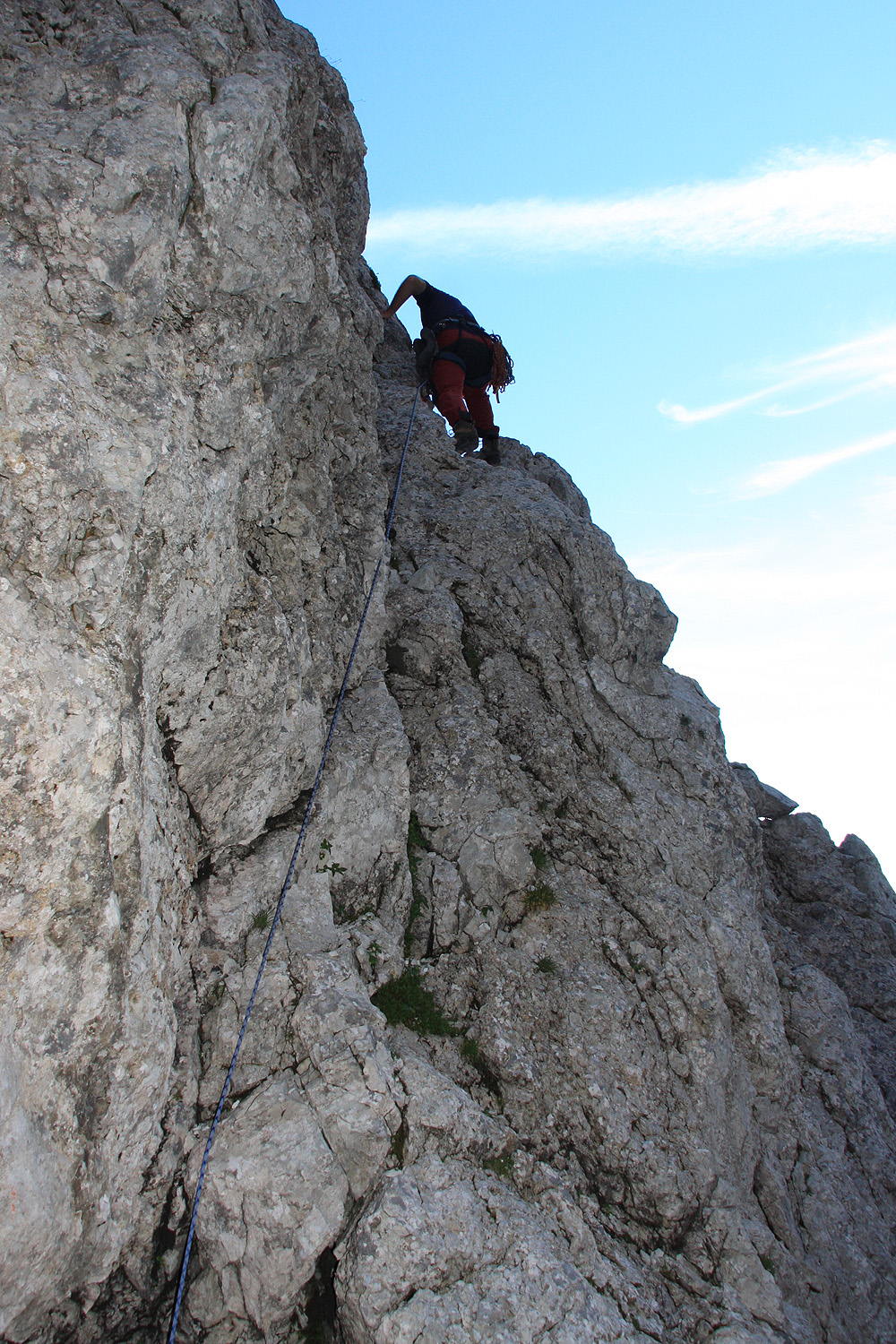 Težje - gladke segmente zaradi varnosti zlezemo skupaj. Za zadnja dva raztežaja se odločimo za sicer težjo in nekoliko daljšo levo varijanto, vendar lepšo od normalne. Ni nam žal, postreže nam s prečenjem pokončne stene, dvema skokoma in grebenskim plezanjem do vrha.