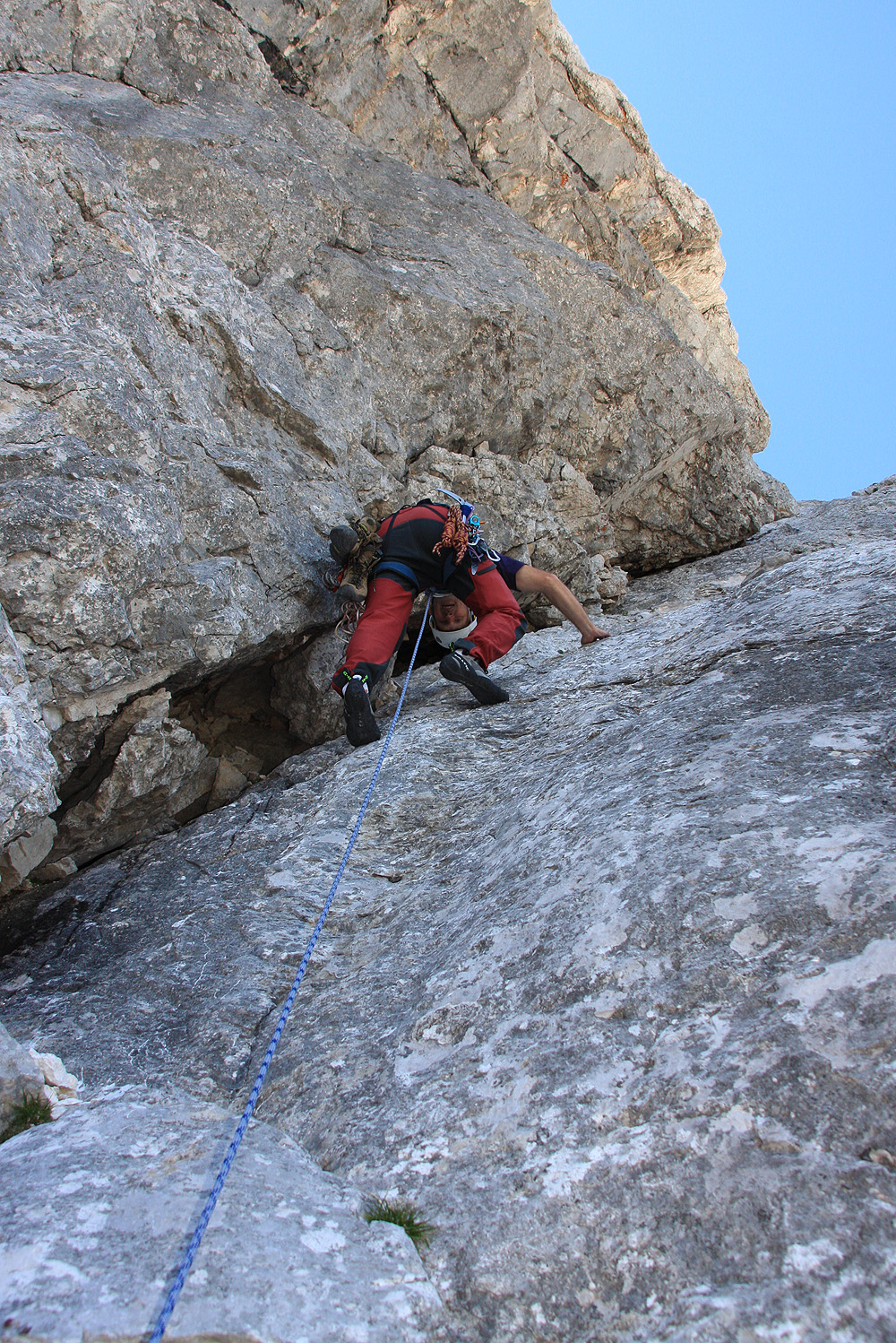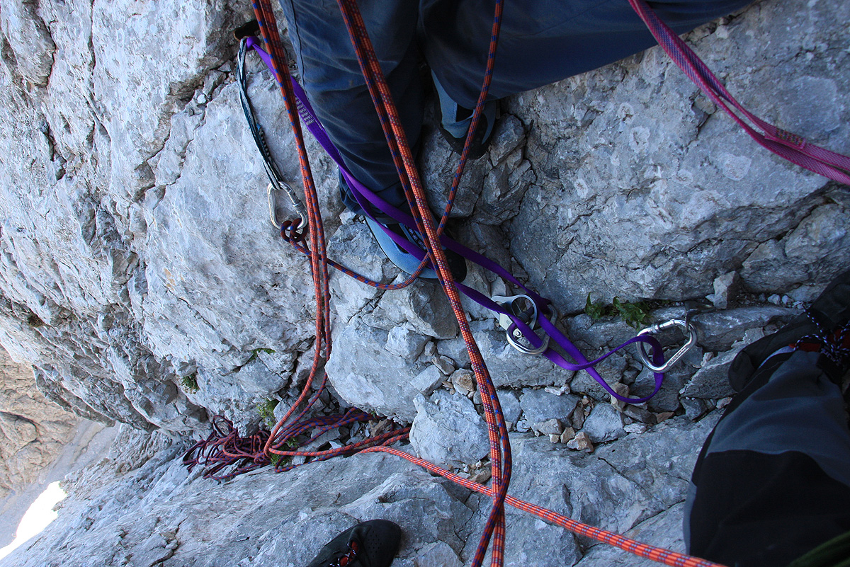 V steno smo vstopili malce nad začetkom zavarovane poti. Kot prva naveza sta startala Pavel in Majda, nekaj kasneje pa tudi midva z Marjanom. Prvih nekaj metrov vzpona okoli skale ni bilo nič posebnega, nato pa sem se znašel v dilemi: ali po polički malce navzdol okoli stene, ali pa v kamin levo nad mano. Kar nekaj minut kličem na vso moč Majdo v prvi navezi, vendar zaman. Očitno je bila takrat že daleč naprej. Pokličem Marjana pod mano, tudi on še ni bil v tej smeri. Tako je odločitev padla name. Pričakoval sem, da bo šlo bolj ali manj navzgor, zato se odločim za pokončen kamin. Prvi meter, dva je bilo plezanje kar udobno, potem pa teren vse bolj krušljiv in pokončen. V zgornji polovici kamina sem imel občutek, da je tole kaj več kot navadna štirica. Zlezem še zadnji najtežji del in pridem pod nekoliko previsno ploščo, ki bi jo brez tovora verjetno tudi naskočil. Klina, ki bi ga nama naj pustila prva naveza pa nikjer! Takoj pomislim na Pavla. Na tako zahteven (krušljiv) teren brez varovanja on že nebi peljal nikogar. Iz vrha kamina končno uspem doklicati Pavla, ki je bil takrat že daleč naprej v drugi steni. Z Marjanom pa zaradi razdalje nisva imela komunikacije. Sedaj mi je kapnilo, da sem spodaj izbral napačno. Pavel se takoj ponudi, da pride cel raztežaj nazaj pome, Marjan nekje daleč pod mano sprašuje kaj se dogaja, vendar imam občutek, da me ne sliši. Sam pa razmišljam kako bom s težkim nahrbtnikom varno splezal krušljiv in strm kamin navzdol.