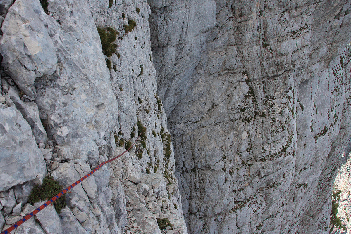 Gornji del smeri - dva raztežaja do izstopa. Pogled nazaj dol, po prečenju stene.