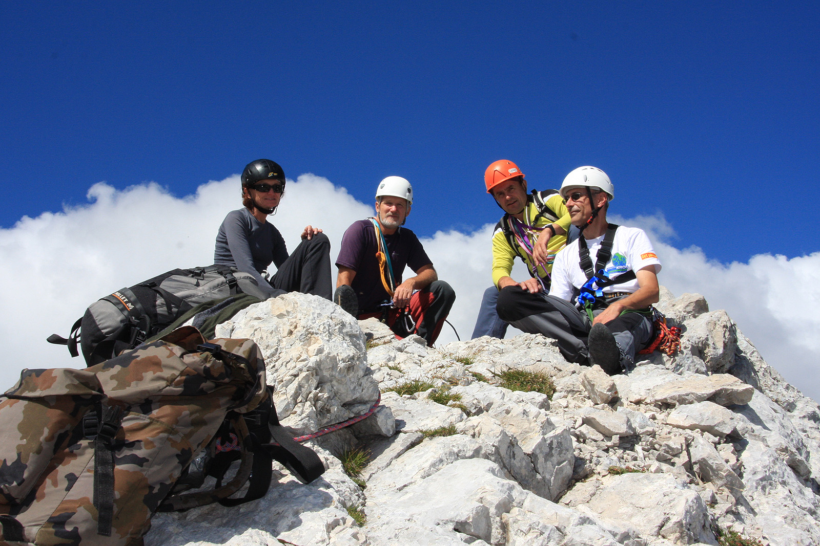 Ko prilezemo na vrh Male Rinke je Kamniško sedlo globoko pod nami. Vsi smo veseli, saj je za nami zares lep plezalni vzpon v odličnih vremenskih razmerah. Vsi štirje smo se tudi dobro ujeli. Tako, da je bilo pravi užitek biti v steni tudi v tem pogledu.
