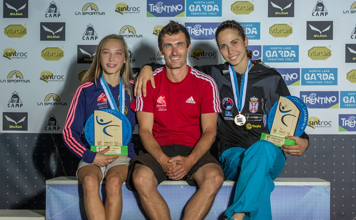Janja: “Svetovno mladinsko prvenstvo v Arcu je bila tekma katere sem se najbolj veselila in za katero sem se tudi najbolj pripravljala. Tja sem odšla izjemno motivirana in pripravljena na vse. Začelo se je s kvalifikacijami v balvanih. Odplezala sem sproščeno in komaj sem čakala na polfinale. Naslednji dan so se mi v izolacijski coni ure čakanja zelo vlekle in komaj sem čakala, da pride moj čas. Prav tako kot za polfinale, sem se v finale uvrstila kot 1., katero mesto sem tudi obdržala. Ciljala sem na stopničke, ampak 1. mesto pa je bilo presenečenje tudi za mene in prav tako lep začetek svetovnega mladinskega prvenstva. Tudi ostali člani reprezentance so dosegli lepe rezultate, še posebej C-teamovci. Staša je z odličnim plezanjem postala svetovna mladinska prvakinja, Urška pa si je priborila prvi finale na svetovnem mladinskem prvenstvu, ampak ni bilo vse tako rožnato, saj je Zan, ki je celo leto treniral balvane, le za eno mesto zgrešil polfinale. Tjaša, Nejc in Sara so tekmo zaključili v polfinalu. Naslednji dan so se že začele kvalifikacije v težavnosti, katere sem se najbolj veselila. Tjaša in jaz sva se z dobrim plezanjem uvrstili v polfinale, ki pa se je za Tjašo zaradi napake končal prehitro. Tako sem se kot edina slovenka v kategoriji kadetinj uvrstila v finale. Med polfinalom in finalom pa so potekale tudi kvalifikacije v hitrosti. Ta disciplina mi ni blizu, ampak sem v njej tekmovala samo za kombinacijo. Bila je lepa izkušnja, vendar je ne bi trenirala. Lahko pa sem ponosna, da sem podrla slovenski rekord. Po 8 napornih plezalnih dneh pa se je začel še zadnji finale svetovnega mladinskega prvenstva. Pred finalom sem bila kar malo živčna in nervozna, še sreča, da je bil z mano Gorazd, ki me je miril in dajal še zadnje spodbudne besede. V smer sem tako vstopila sproščeno ter jo tako odplezala tudi do vrha. Tako sem odnesla dve zlati medalji in eno srebrno v kombinaciji.“
